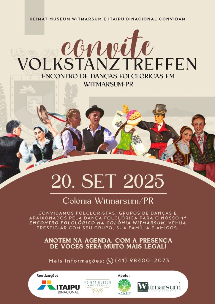A Colônia Witmarsum, um dos mais importantes redutos da cultura Menonita no Brasil, sediará seu primeiro Volkstanztreffen, um grande Encontro de Danças Folclóricas, no dia 20 de setembro de 2025. A iniciativa, organizada pelo Heimat Museum Witmarsum, convida grupos de dança, folcloristas e o público geral a celebrar a diversidade cultural. O evento ganha destaque ao contar com o apoio estratégico da Itaipu Binacional, sinalizando o potencial do encontro para se firmar no calendário cultural do estado.