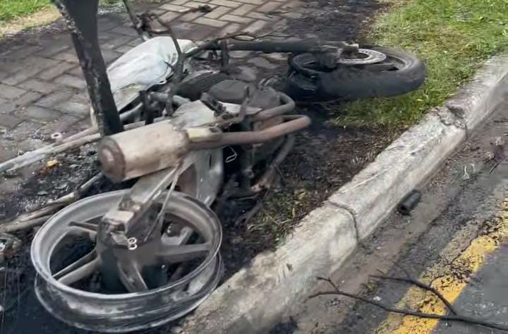 No início da manhã de hoje, por volta de 7 horas, uma motocicleta queimada foi localizada na avenida Daniel Mansani, em um dos acessos ao loteamento Green Park.