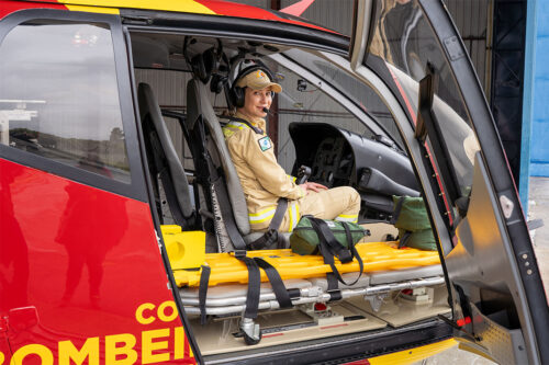 A capitã Keyla Karas a bordo do Arcanjo 01, do Corpo de Bombeiros Militar do Paraná: de Palmeira para os céus do Paraná ajudanda a salvar vidas. Foto: AEN / Divulgação