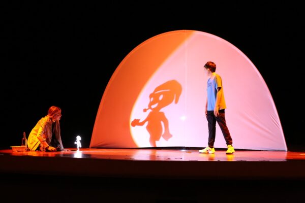 A encenação combina diversas linguagens artísticas: música ao vivo, teatro de sombras e teatro de bonecos se entrelaçam para criar uma atmosfera lúdica e envolvente.