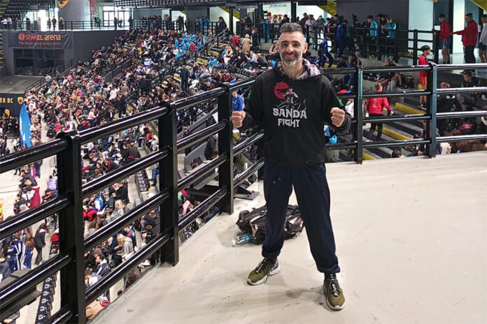 Fabiano Oliveira na Sunel Arena, em Atenas, onde vai lutar neste domingo no Acropolis Tournament Kickboxing Golden Cup. Foto: Divulgação