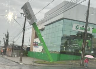 VENTANIA DERRUBA PLACA DE BANCO, QUE FICA PENDURADA EM FIAÇÃO ELÉTRICA